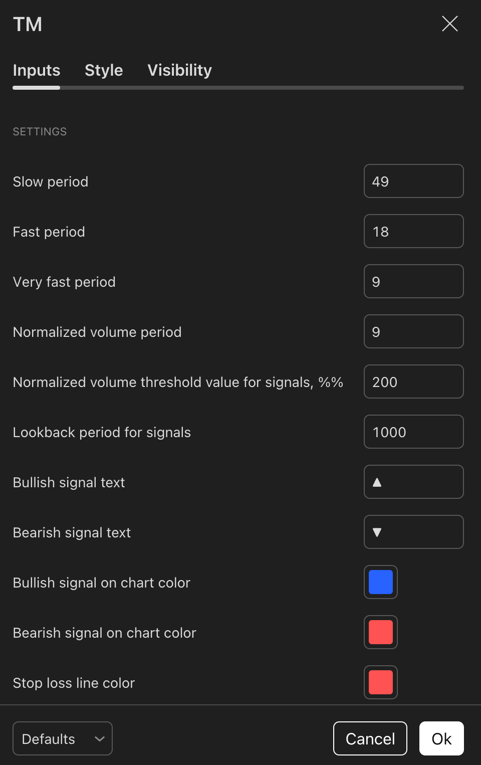 - Inputs in Status Line: Show active input values in the chart’s status bar.