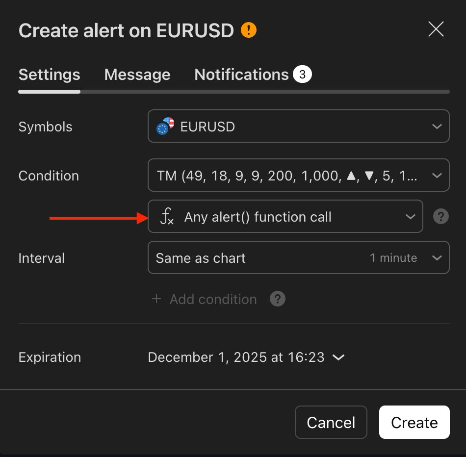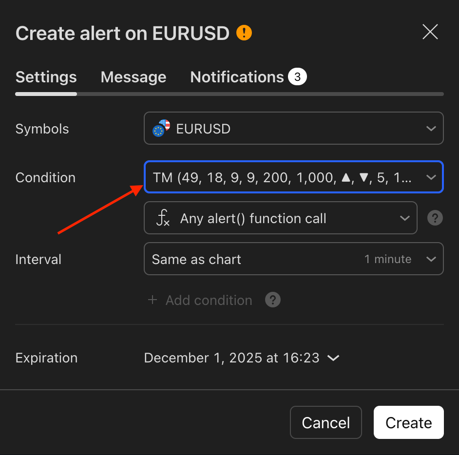 Step 1: From the indicator settings, customize your alerts by defining your desired parameters. The selected configurations will be used for notifications in Step 2.