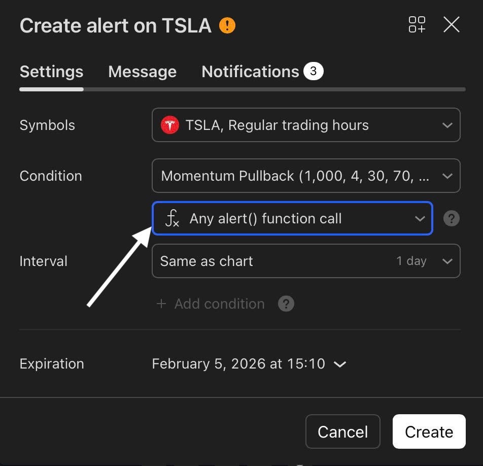 Click TradingView’s “Alert” icon to enable notifications such as pop-ups, sound alerts, emails, Webhook URL, or email-to-SMS.