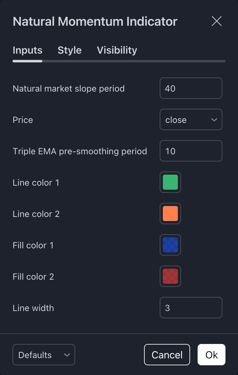 Natural Market Slope Period: Adjust to make the indicator more or less sensitive to price movement. Shorter periods yield quicker signals; longer ones smooth out volatility.