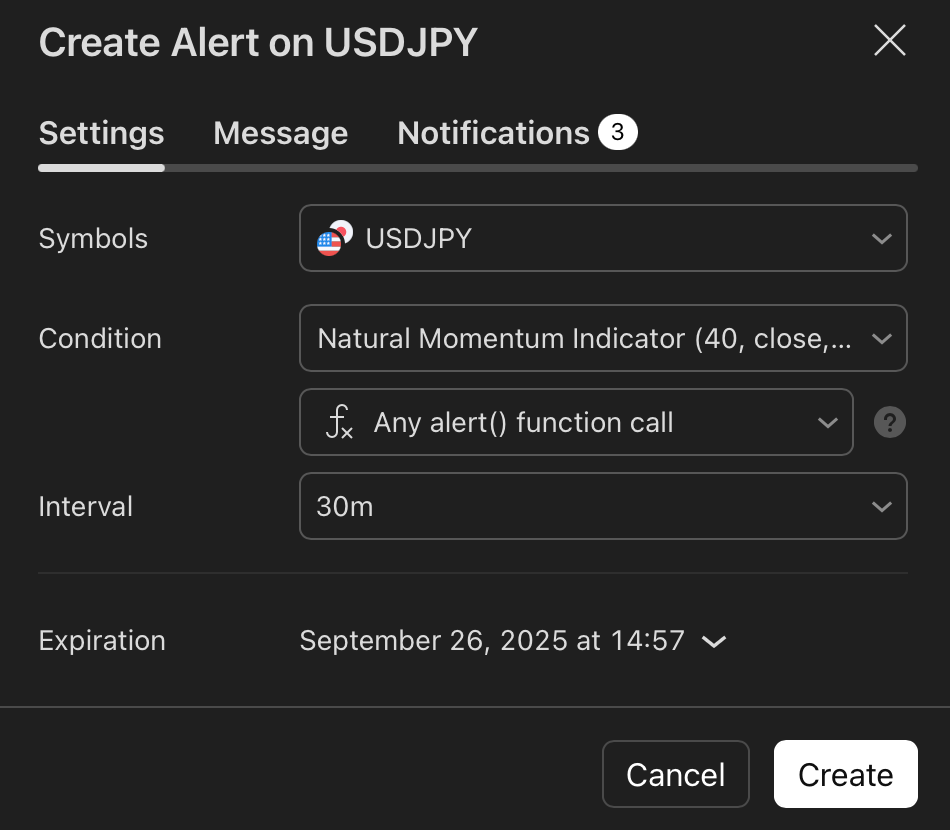 Step 1: From the indicator settings, customize your alerts by defining your desired parameters. The selected configurations will be used for notifications in Step 2.