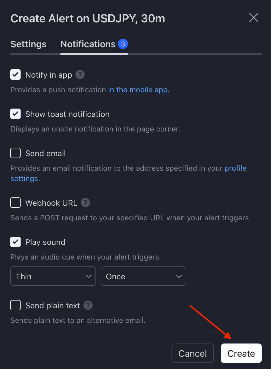 Step 2: To receive notifications through the app, pop-ups, alert emails, Webhook URL, sound alerts, or email-to-SMS, enable these features by clicking on TradingView's “Alert” icon.